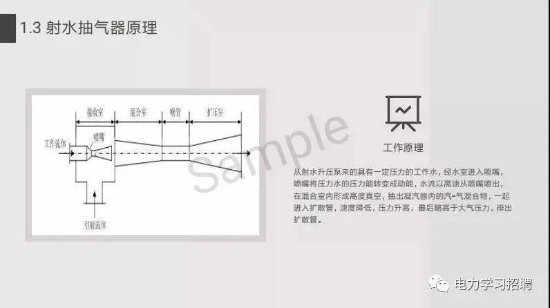 一、 射水抽汽器工作原理:從射水泵來的具有一定壓力的工作水經水室進入噴嘴,噴嘴將壓力水的壓力能轉變為速度能,水流高速從噴嘴射出,使空氣吸入室內產生高度真空,抽出凝汽器內的汽氣混合物,一起進入擴散管,水流速度減慢,壓力逐漸升高,最后以略高于大氣壓力排出擴散管。