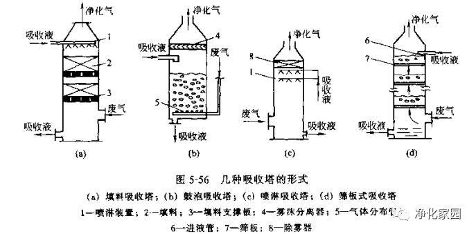 在產(chǎn)品生產(chǎn)中的濕法化學(xué)腐蝕、酸液清洗、實(shí)驗(yàn)室內(nèi)均有酸性氣體排出,在這類酸性氣體的排風(fēng)系統(tǒng)通常設(shè)置溫式洗氣吸收塔,處理后排入大氣,圖5-56是幾種吸收式洗氣塔的形式。實(shí)際設(shè)計(jì)時(shí)應(yīng)根據(jù)酸性氣體的類型、濃度選用合適的吸收液和吸收塔的形式[20]。