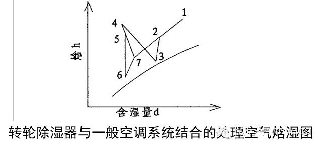 對于室內冷負荷和濕負荷都較大的場合,或新風負荷較大,室內要求濕度較低的環境,如果靠常規制冷就要降低蒸發溫度或采用乙二醇溶液,把空氣冷卻到很低的溫度,有時還要加熱以防房間溫度過低。這樣既增加系統能耗,而且冷卻盤管容易結霜,導致COP值下降。如果由轉輪除濕器承擔濕負荷,機械制冷承擔顯熱負荷,就能達到比較滿意的效果。這就是除濕技術與一般空調相結合的基本思路。在這里使用的是氯化鋰轉輪除濕器。