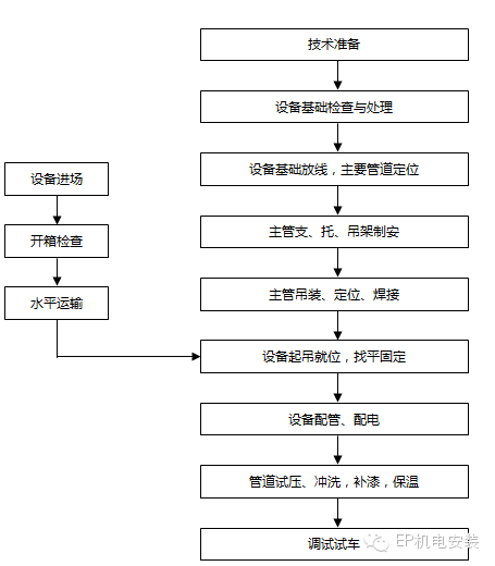 大型冷凍機房的安裝工藝順序在解決了相關的技術問題后,施工工藝流程圖可以表述如下圖:
