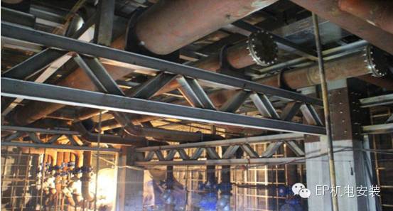 機房內主管的布置多沿樓板底及柱邊懸空敷設,多條平行排列。因此可以綜合考慮制作聯合支架。聯合支架的制安,必須充分考慮承受自重(管重加上介質重量),而且管道支架所承受負荷必須經過受力計算復核。
