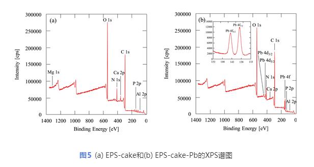 EPS-cake和EPS-cake-Pb的FTIR光譜圖(圖4)中均顯示了多糖、蛋白質、脂質和核酸中的典型官能團,表明Pb2+沒有改變EPS中的分子結構。對于EPS-cake-Pb,COO-的反對稱伸縮振動峰(vascoo-)與對稱拉伸振動峰(vscoo-)之間的距離變大,表明EPS中羧酸根以架橋形式與重金屬離子作用。