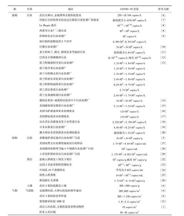 新冠病毒隨著醫院廢水、市政污水等排放后,經污水管道最終進入污水處理廠。一方面,新冠病毒通過吸附與解吸作用實現在水相與固相間的相互遷移。另一方面,病毒會隨著廢水中顆粒的霧化溢出至氣溶膠內,并隨著氣溶膠的沉降作用又將新冠病毒重新帶回污水以及土壤中(圖1)。各國研究者為更好防控疫情,研究新冠病毒在不同介質中的賦存特征,檢測并定量新冠病毒的濃度范圍,分析新冠病毒的傳播能力與影響情況。不同介質中新冠病毒的分布與濃度如表1所示。