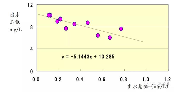 上圖顯示了某污水廠采用A2O方法處理的水質。可以看出,出水總磷總氮的關系是相互制衡的,當處理出水的總氮低時,總磷高;當總氮高時,總磷低。也就是說,如果采取提高氮去除率(降低排出的水的總氮濃度)的工藝操作,則生物除磷的效果就會變得不穩定(總磷濃度增加)。一般而言,A 2 O方法的操作條件是100%的外回流比和2000%或更高的內回流比。如果進行通過生物穩定地除去磷的工藝調整,需要減少外回流比,但是又可能會影響總氮的去除率。在一些采用A2O法的污水廠中進行外回流量的調整來觀察總氮的去除情況。在厭氧池中,外回流主要將二沉池底部的沉淀濃縮后的活性污泥帶回來,其主要的作用是提高厭氧程度并保持反應池中活性污泥的高濃度,以促進聚磷菌的磷的釋放。