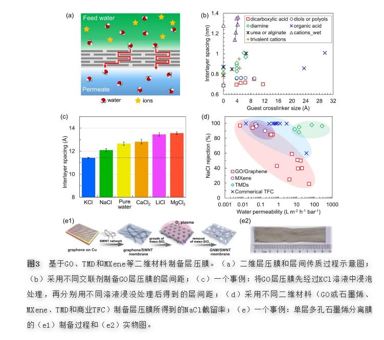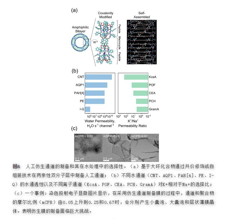先進材料的發展提高了不同膜材料和膜過程對不同目標組分(相對于競爭性組分)的選擇性(表1)。其中,二維(2D)材料(如GO、TMD、Mxene)(圖3)和等孔徑材料(如多孔石墨烯、垂直排列CNT、MOF、COF、液晶聚合物)(圖4)可以用來制備具有層壓結構或者等孔徑結構的水透過型膜,基于空間位阻效應和Donnan效應以及RO或NF過程,實現對水或小尺寸離子相對于大尺寸離子和分子的選擇性分離;離子交換膜涂層材料(如PSS、PAH、PEI、HACC等)和液態膜萃取劑(如LIX84-I、LIX64N、DEHPA、PC88A等)可用于制備高選擇性離子交換膜(IEM)或液態膜(LM)等溶質透過型膜(圖5),在電場或濃差為驅動下,基于“溶解-擴散模型”原理實現對目標離子或分子相對于水或其他競爭性離子和分子的選擇性分離。在該類材料中,目標離子或分子的尺寸可以小于、等于、甚至大于競爭性離子、分子等污染物;仿生水通道(如水通道蛋白、大環化合物等)和離子通道(如KcsA、POF、CEA、PCH等)材料可以用于制備仿生膜,以實現水相對于離子、或者目標離子相對于競爭性離子的高選擇性、高通量分離(圖6)。本文對各類材料的種類、功能和潛力做了詳細的分析和討論。